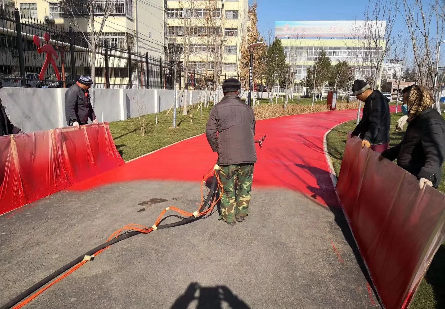 ⑤防滑處理:在彩漿涂層未干透時(shí),撒播防滑顆粒(如石英砂)于濕潤的彩漿表面,使其與涂層結(jié)合,增加路面的防滑性能。