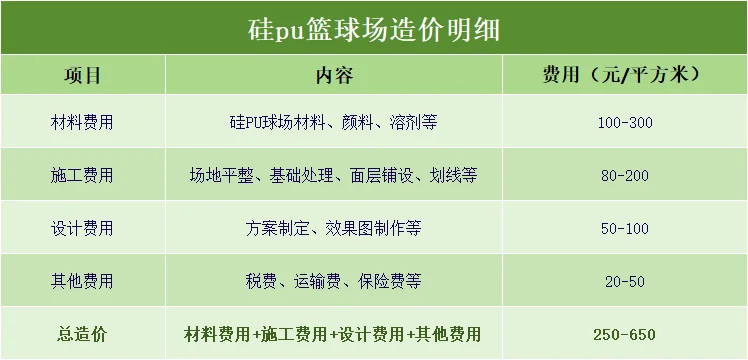 以下是一個簡化的硅PU籃球場造價明細表格,僅供參考: